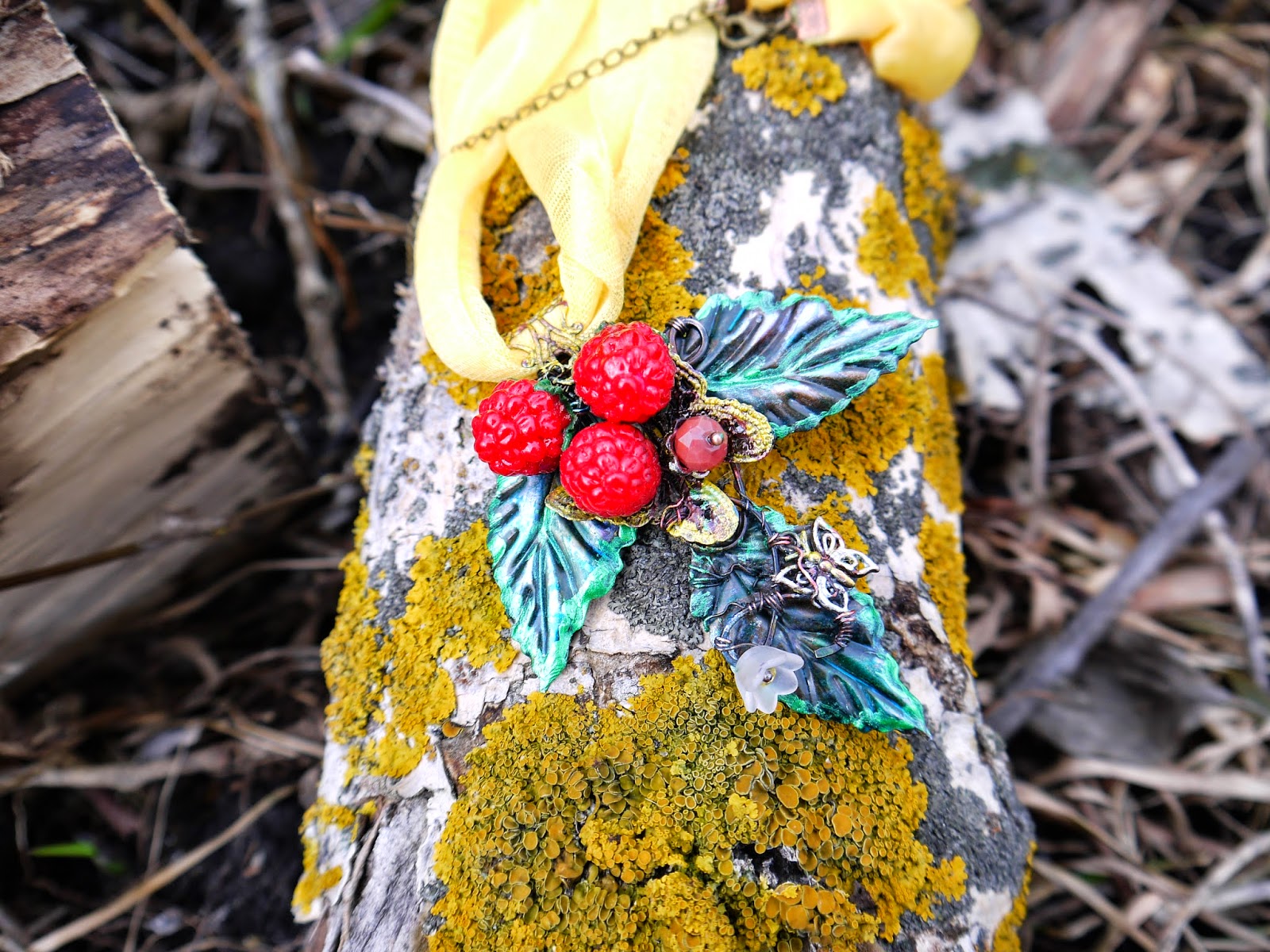 Это моя новая работа, вчера доведенная до последнего штриха. Вместо цепочки, решила украсить ярким желтым принтом, по-моему сочетание сочного и яркого, как раз в тему сладенькой малинки)
